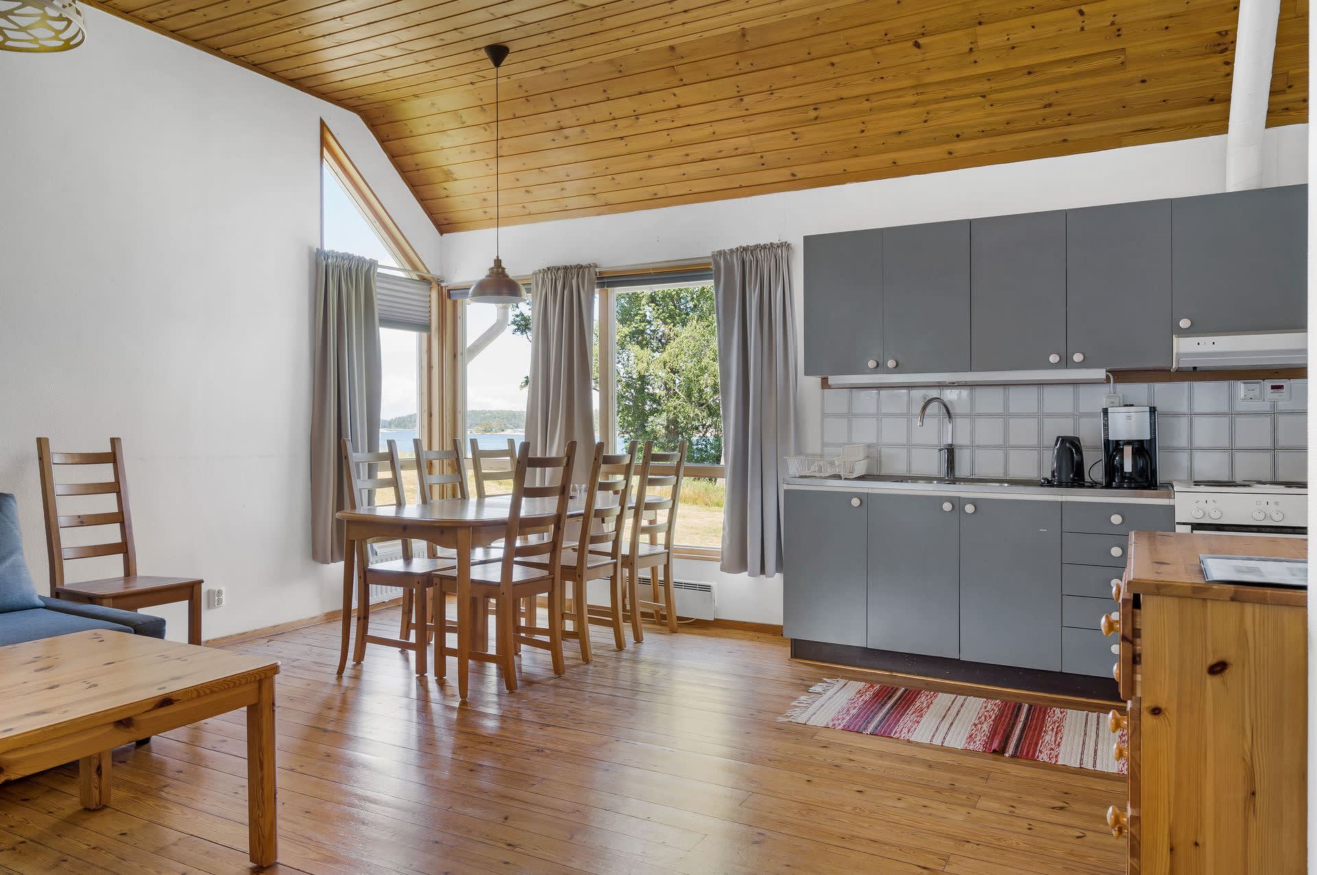 On the edge of the forest lies Gläntan, one of our large cottages with 6 beds and room for extra beds. With a sea view and only 50 m to the beach, you can’t live better if you want to experience the Swedish summer. The house has a private patio. The cottage has two bedrooms and a toilet. The cottage also has a large living room with high ceilings for shared activities and a simple kitchen. Next to the cottage is the service house with showers, sauna, toilets and laundry.